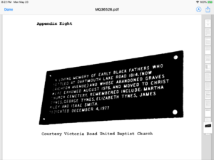 维多利亚路联合浸信会教堂内的一块牌匾是为了纪念黑人居民的坟墓从社区墓地移到基督教堂墓地。