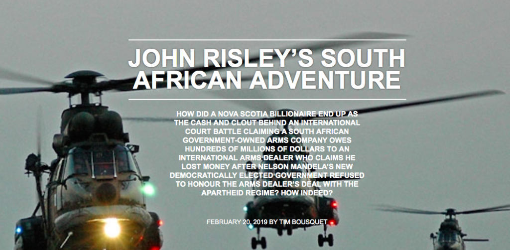 从PayWall后面出来:蒂姆的史诗片新斯科舍省亿万富翁约翰·里斯利(John Risley)是如何与一名军火商就一份种族隔离时代的合同起诉南非政府的。简而言之:结束赛车生涯后,葡萄牙一级方程式赛车手豪尔赫·平霍尔(Jorge Pinhol)成为了一名军火商,并促成了一笔向南非种族隔离政府出售直升机的交易。在非国大掌权后,政府拒绝付给他一大笔佣金。里斯利介入帮助支持此案,以换取一份利润。