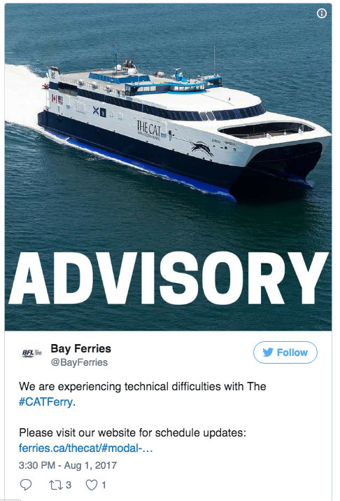 这艘高速轮渡一直靠三个引擎运转自从上个月出现了以前的问题这家加拿大公司的董事长兼首席执行官马克·麦克唐纳(Mark MacDonald)说,这导致该公司缩减了航行计划,可能要到周四才能恢复两个目的地之间的服务。