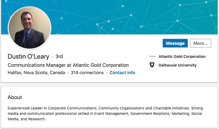 上周二我路过展台时,大西洋黄金公司(Atlantic Gold)的公关经理达斯汀•奥利里(Dustin O’leary)就是其中之一。去年5月,奥利里在舍布鲁克主持了那次倒霉的公共信息发布会,约翰·珀金斯在会上被残忍逮捕,《哈利法克斯观察家报》对此进行了报道在这里而且在这里.