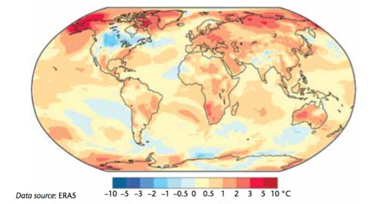 过去五年是世界上有记录以来最热的五年。特别温暖的地区包括澳大利亚部分地区、阿拉斯加、俄罗斯北部、东欧和非洲南部,2019年的气温比平均气温高出2℃以上。北美中部是唯一一个温度低于平均水平的重要陆地地区。