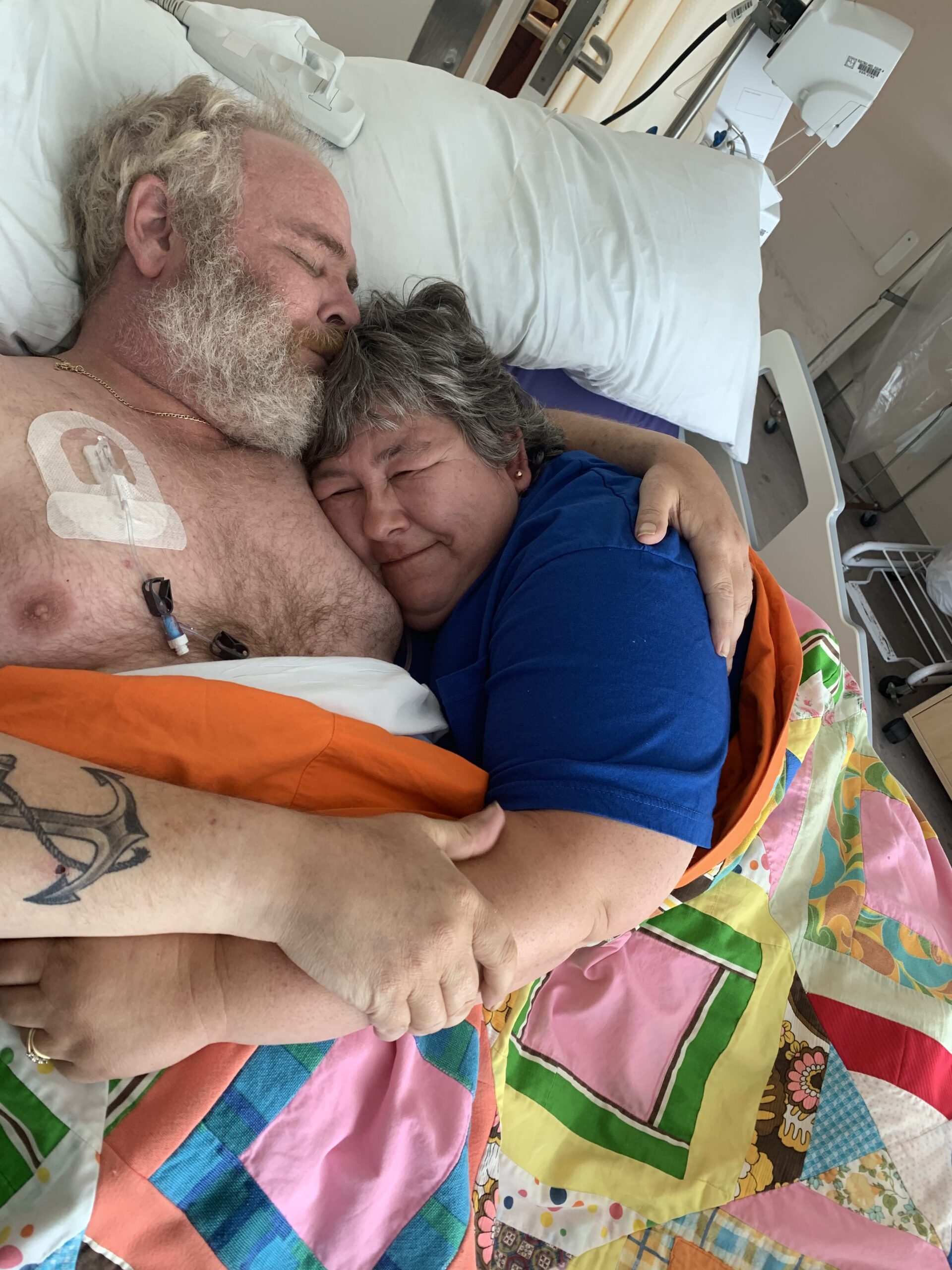 虽然没有专用的、更大的姑息治疗床那么舒适,但在他去世前,这对夫妇可以在身体上亲密接触两周。当她第一次和里克一起爬上减肥床的时候,医院的工作人员拍下了这张感人的照片。