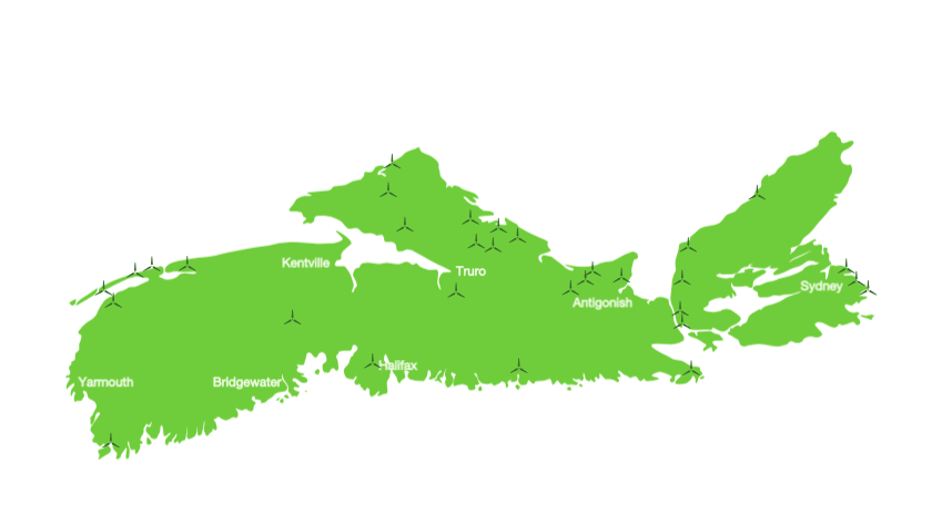 新斯科舍的权力发表了一张地图该省的大型风力发电场。该公司表示,风力发电目前占新斯科舍省发电量的近10%。