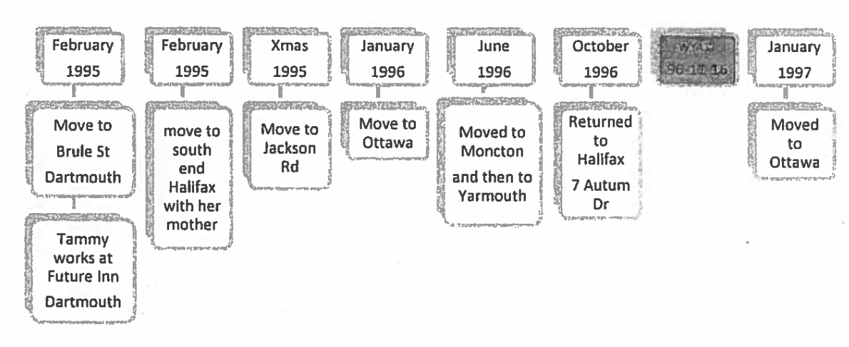 时间轴上的未解决的谋杀包括17岁蒂娜巴伦(她的身体于1985年11月4日在印度溪的一条沟中发现);27岁的安·梅森(在1986年3月28日在一个罗利街房间遇难);19岁的金伯利McAndrew(最后在1989年8月12日在Quinpool Road Canadian轮胎中看到的停车场,并假定被谋杀);31岁让迈拉(她的身体于1990年4月5日在谷物电梯上发现);21岁卡拉斯特里克兰(她的身体于1991年6月5日在Shubie Park发现);17岁雪莱康纳斯(她的身体由1993年6月1日的Spryfield Lions Rink发现);25岁金柏卢卡斯(她的尸体于1994年11月23日在北街5783号后被发现);52岁的Jaime怀亚特(他是名单上唯一的男人,1996年11月12日在英格利斯街的双榆树汽车旅馆失踪);30岁的水晶杰克(于1997年7月15日,她的Agricola Street Apartment失踪,她仍然发现了2011年的高速公路101);32岁的瑞秋麦克卡利(她最后一次露面是在1997年9月27日,离两年前布伦达·韦被谋杀的地点大约两个街区;2002年,她的遗体在101号公路外被发现);和35岁罗宾哈特里克(她的身体于1999年9月10日在港口景观后面发现了关于Brenda Way谋杀案的两个街区)。