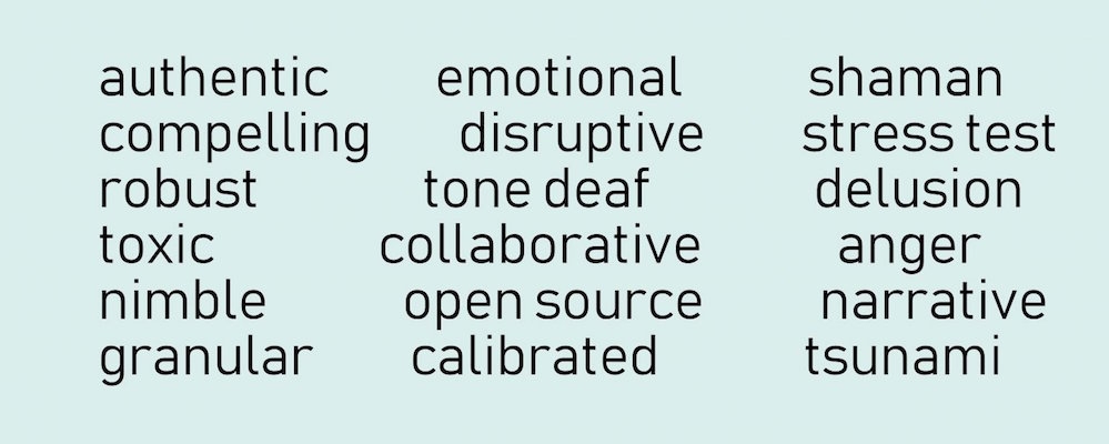 大约在1970年,《时代》杂志发表了三个专栏的行话,称为“瞎说生成器”(Baffle-Gab Generator)。你所要做的只是从每一栏中随机选择一个单词,来制造一些当代的、听起来很胡言乱语的东西。只是为了你,我从我收集的单词中制作了一个最新的生成器。装满你的靴子。