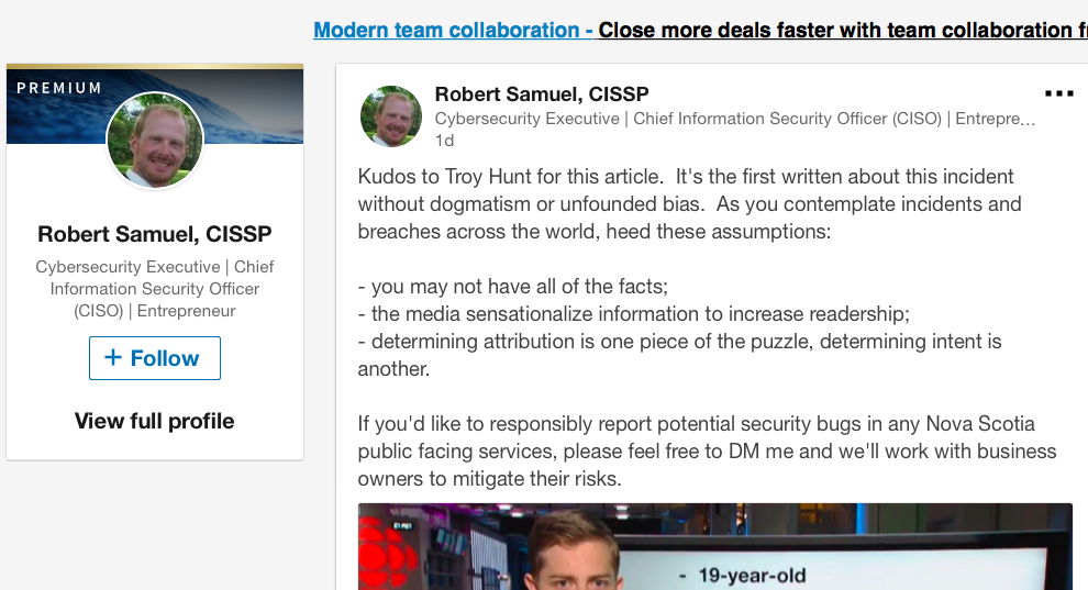 哦,昨天还,我叫了罗伯特·塞缪尔,全省的首席信息安全官,对除其他事项外通过他的LinkedIn账户进行正式省级创业。天色已晚,昨日,撒母耳记下了他的LinkedIn的职位,但我当然有它的屏幕截图。这里是: