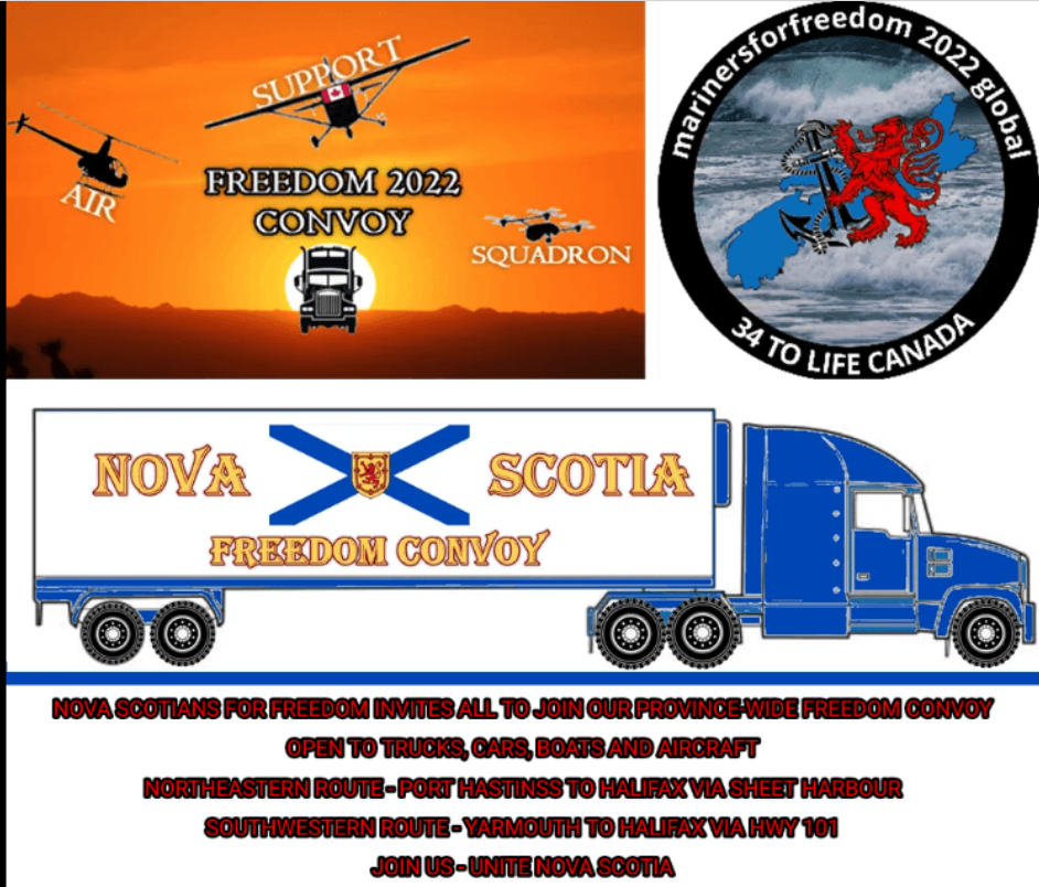 糟糕的图片和难以读懂的文字还在继续,这周六还在宣传一个自称为“新斯科舍省自由车队”的活动,车队将从山谷、雅茅斯地区和布雷顿角出发,前往哈利法克斯市中心。