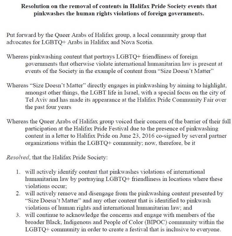 晚上的有争议的观点,导致400多人的投票率,是哈利法克斯的奇怪阿拉伯人的议案,骄傲识别和去除使用LGBTQ +友好内容的政府或公司的粉红色内容,以违反人权或者侵犯人权企业不当行为。