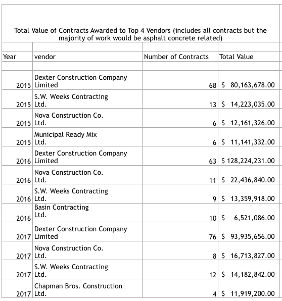 结果可想而知:德克斯特建筑公司几乎垄断了省级沥青工作。例如,去年,德克斯特获得了76个工作岗位,价值9390万美元,而最活跃的竞争对手新格拉斯哥的S.W. Weeks只获得了12个工作岗位,价值1420万美元。