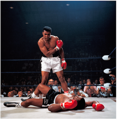 Muhammad Ali reacts after his first round knockout of Sonny Liston during the 1965 World Heavyweight Title fight at St. Dominic’s Arena.