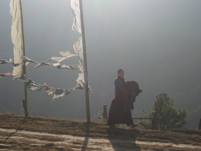 不丹尼尼姑走在与她的洗衣店,Pema tekchok尼姑庵,唐谷的唐谷。照片:Linda Pannozzo
