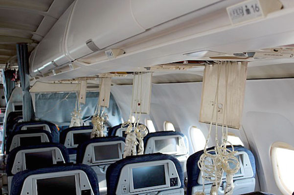 在疏散过程中未使用前右和后部退出。在初次审查这些出口期间没有差异差异。该飞机的检查显示座椅排31和33中的右侧舱底,以及与机舱后部附近的飞行助手折叠座椅相邻的地板从下方通过飞机结构刺破。没有定位器天线结构的碎片穿透驾驶舱。