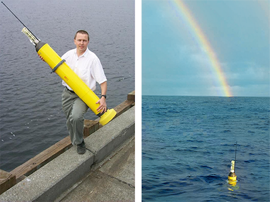 Dana Swift(左,华盛顿大学)手持Argo Float,这是一种自主的、自由漂浮的海洋设备,在四年多的时间里,每10天收集包括温度在内的各种数据,超过6000英尺,在部署时不需要船只(右)。每台仪器重约65磅。照片:美国国家海洋和大气管理局