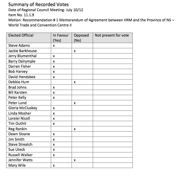以下是议员们对2012年新会议中心融资协议的投票结果: