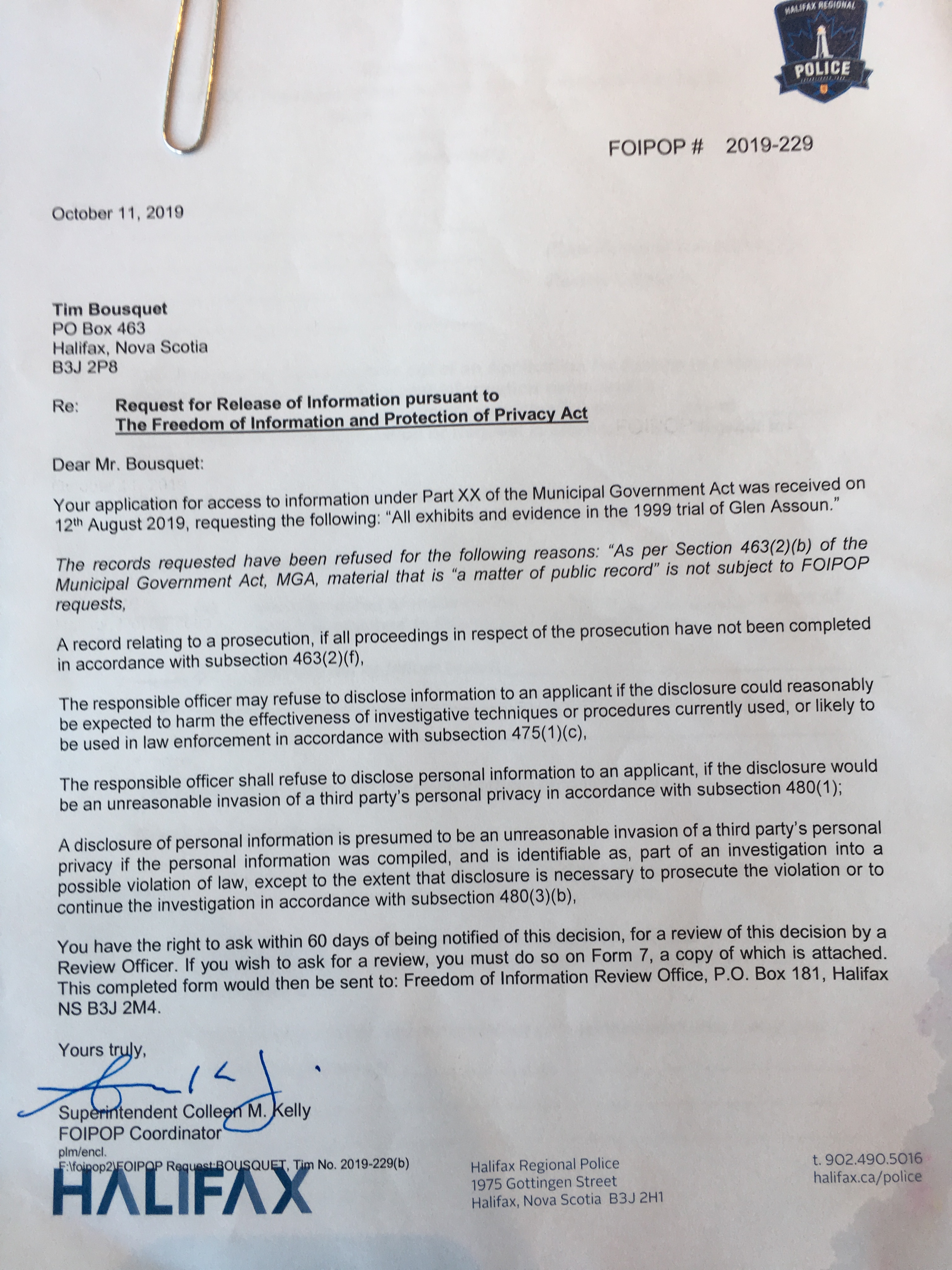 然而,周四,我收到了一封来自哈利法克斯警长Colleen M. Kelly的信,信中告诉我,我根据《信息自由》提出的关于1999年审判证据的请求被拒绝了。你可以看看那封信在这里.