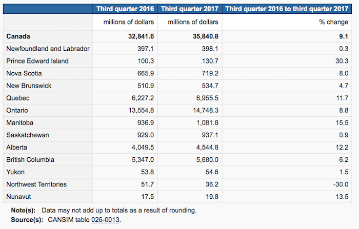 投资于新住宅建设的资金继续增加。加拿大统计局的数据昨天发布显示,2017年第三季度,在新斯科舍省的支出为7.192亿美元,比2016年同期增长8%。