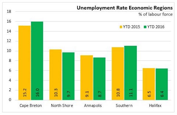 据报道,布雷顿角地区2016年前8个月的就业人数比2015年前8个月减少了4000人。同期劳动人口减少了4300人。由于就业人数减少的速度快于劳动力人数减少的速度,最终结果是失业率上升0.8个百分点,至16.0%。