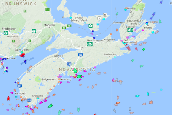 周一上午9点半,新斯科舍附近海域。地图:marinetraffic.com