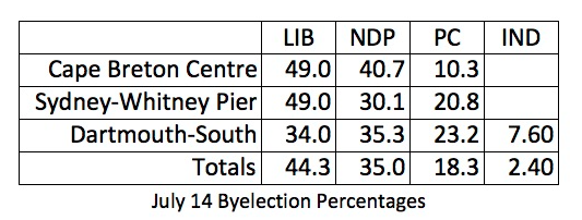 从表面上看,对于斯蒂芬·麦克尼尔领导的执政党自由党来说,这是一个美好的夜晚:在布雷顿角的两个席位上取得了决定性的胜利,而在达特茅斯南部,他们上一次赢得了这个席位。自由党在这三个选区的总得票率为44.3%,仅比两年前的45.7%略有下降。