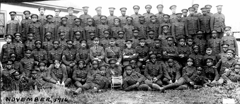 1916年7月5日,第一个也是唯一一个加拿大黑人营被正式授权成为加拿大远征军的一部分。Lieut.-Col。丹尼尔·休·萨瑟兰被任命为Pictou, N.S.部队的指挥官。(萨瑟兰是一名白人铁路承包商,几个月前入伍。)