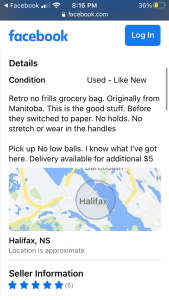 我不知道这篇文章最好的地方是什么。他是不是觉得有必要澄清这个包来自曼尼托巴无装饰?是他把这种情况列为“像新的一样用过”,并指出它的把手没有拉伸或磨损吗?或者,除了750美元之外,他还会不厌其烦地把它送到你手里,只多花5美元?也许这只是这家伙散发出的自信的整体氛围?“不要低球。我知道我得到了什么。”我可以告诉你,这个人知道怎么卖旧购物袋。