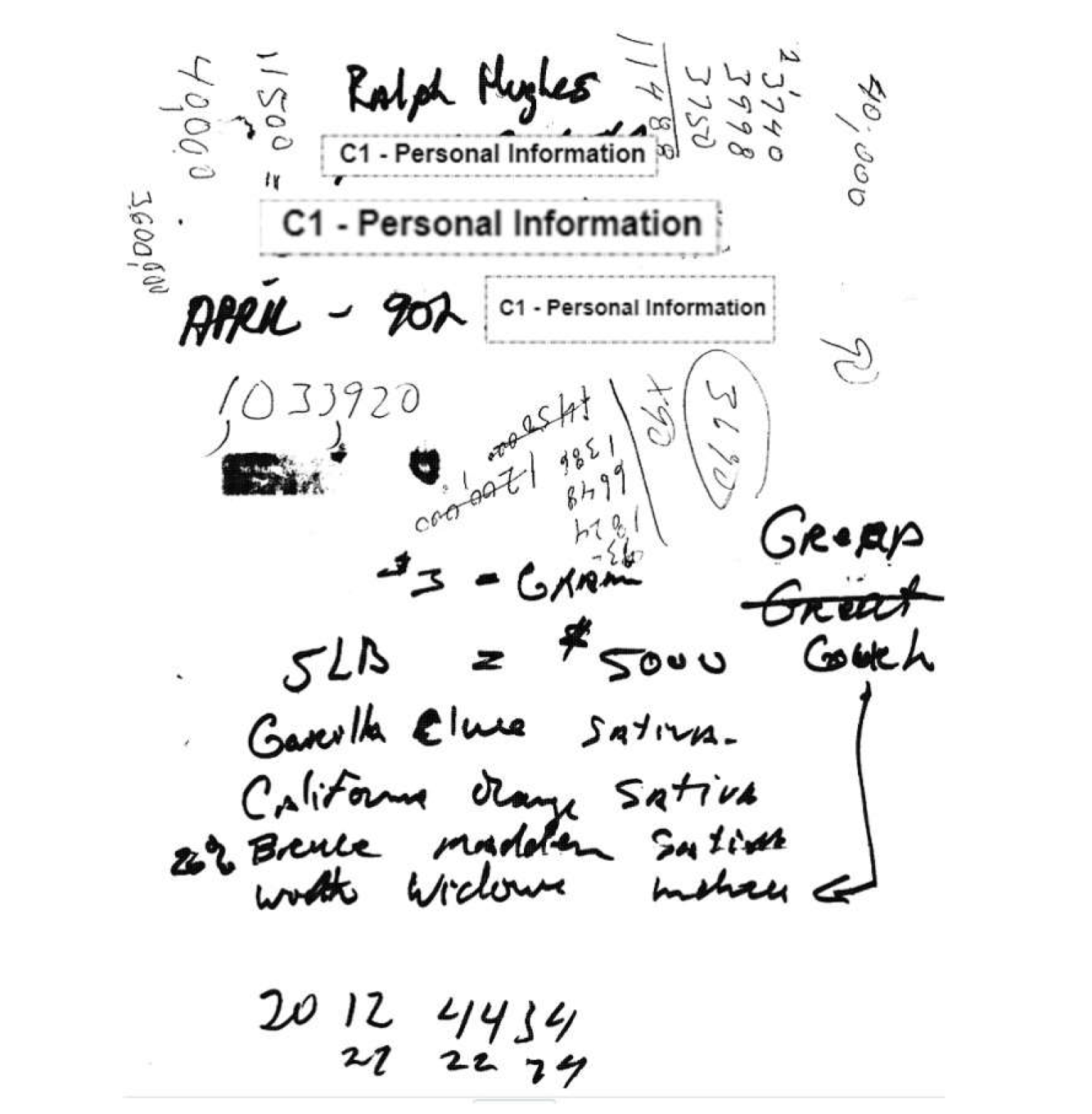 GW’s Via Rail boarding pass was for a trip nine years later. There’s no evidence that he was involved with transporting drugs during that period, but there’s also no explanation for how he suddenly would be in a position to acquire and presumably sell large quantities of cannabis. The list reads “5LB = $5,000,” and then names various strands of Sativa.