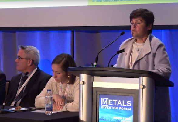Atlantic Gold总裁Maryse Belanger在2019年PDAC大会上发言;Belanger在金属投资者论坛上表示,"我总是说,这不是为了制造黄金,而是为了赚钱。"