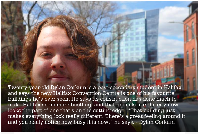 有个女人在街上拦住了我和我女朋友想要一个关于哈利法克斯生意增长的简短采访。我对商业一窍不通,所以我只是说,我认为新的会议中心的开业可能会给这个城市带来更多的商业会议或其他东西。她说这篇文章会登在一些商业杂志上,但现在它上了报纸,而且显然我真的很喜欢会议中心,这对我来说是新闻!从来没说过它让城市变得更繁忙,或者让城市处于“前沿”,而且它肯定不是我最喜欢的建筑,哈哈。