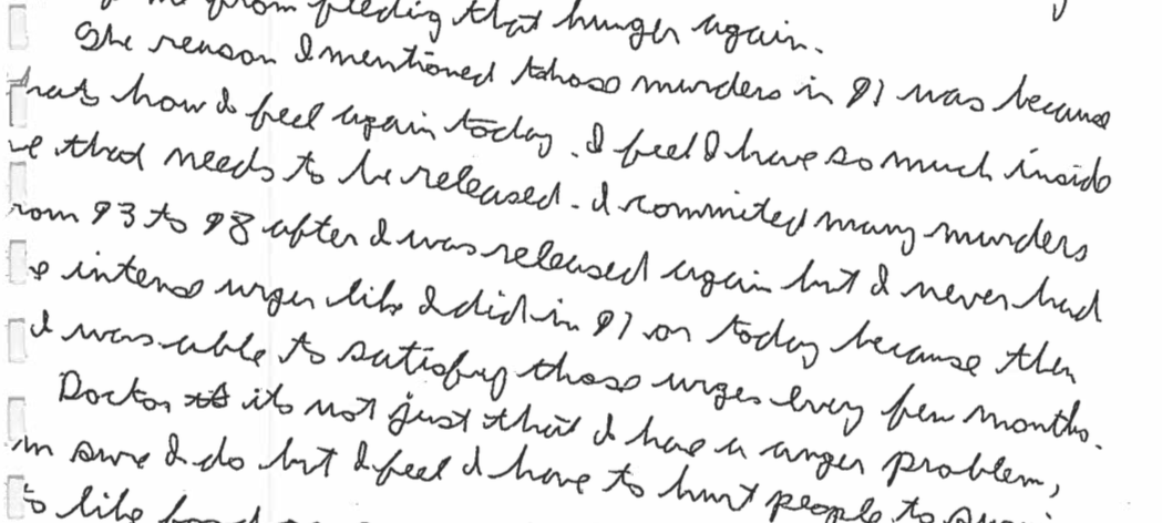 “我有这么多的愤怒,然后[1991年]”他写道。“但我从来没有一个冲动的杀手。我可以随时控制它,直到我在一个我可以执行谋杀的安全空间中得到一个受害者。I’ll never forget those 21 days on the run because I remember [while in prison] I could not satisfy my hunger (for that is what it feels like, a hunger) for fear if I was around inmates I would have nothing to stop me from feeding that hunger again.”