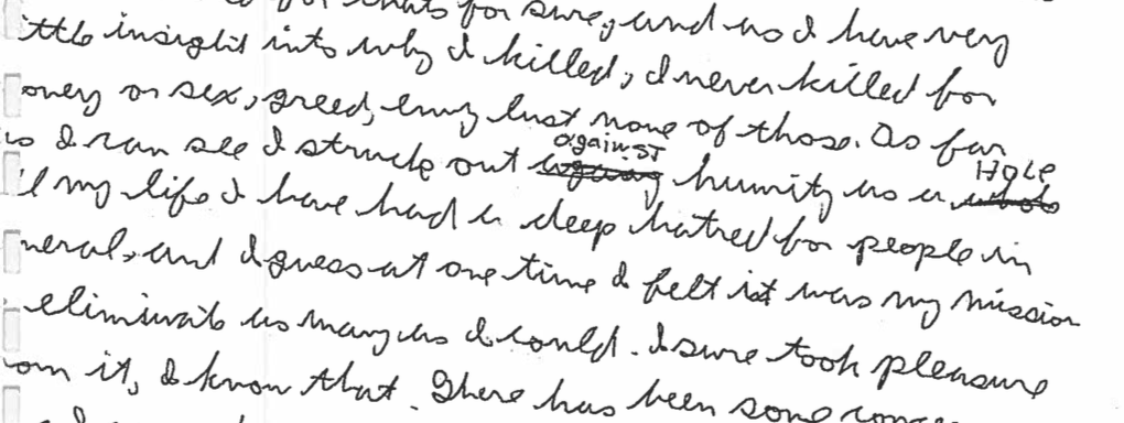 “离我上次杀人已经有五年了,”他继续说道,“这是我自17岁以来最长的一次不伤人的经历。我想结束这一切这样我就能像个普通囚犯一样在别的地方工作了。但我怀疑这是否会发生。”