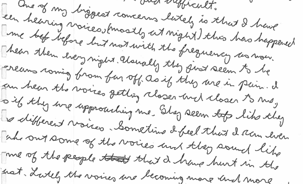 “At first I used to think these voices were just a side effect for some of the things in my past, but now I’m starting to think that they might be some kind of retribution against me for all the people I’ve hurt,” he wrote.