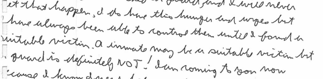 麦格罗告诉精神科医生,他已经在安全的住房统一中被归咎于肾脏,因为他威胁要杀死一名警卫。“现在这是非常非常这很重要,”麦格瑞写道,“这永远不会发生!我不笨!我知道如果我袭击警卫,我在这里的生活会是什么样子,我不会让这种事发生的。我确实有这种渴望和冲动但我总是能够控制它们直到我找到一个合适的受害者。犯人可能是合适的受害者,但狱警绝对不是!”