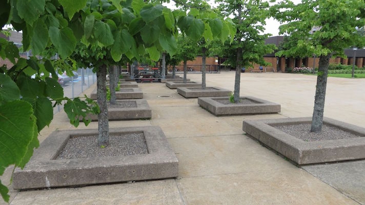低矮的花盆似乎“漂浮”在铺好的广场上。