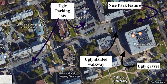 Dal图书馆和化学楼之间的混凝土和砾石荒地一直困扰着我。它不是隐藏的,它就在主四边形的旁边——为什么不把达利才华横溢的景观团队放上去呢?去年夏天他们把它拆了,我曾寄予厚望,但他们用更多,更新的混凝土代替了它。