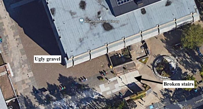 我把这个问题留给别人去讨论灌木丛的优点,但就我自己而言,我无法理解大楼西侧的那一段砾石。也许那是最初设计的一部分?不管怎样,这感觉就像一个不完整的建筑工地,尤其是从图书馆往上走的楼梯有一半因为台阶坏了而被锁住了。已经这样好多年了,所以我想现在还没有修复它们的计划。一旦你爬上了没有链条的楼梯段,你就得绕着砾石走,走到一个角度奇怪的走道,这条走道会把你带到一个丑陋而杂乱无章的停车场,它延伸到达利学院和国王学院之间。这些都行不通。这很危险——行人和汽车在同一段人行道上争抢。它没有很好地为人们服务——即使是吸烟者也聚集在停车场的混凝土轮车站上。丑陋的。感觉就像大学里的破洞。