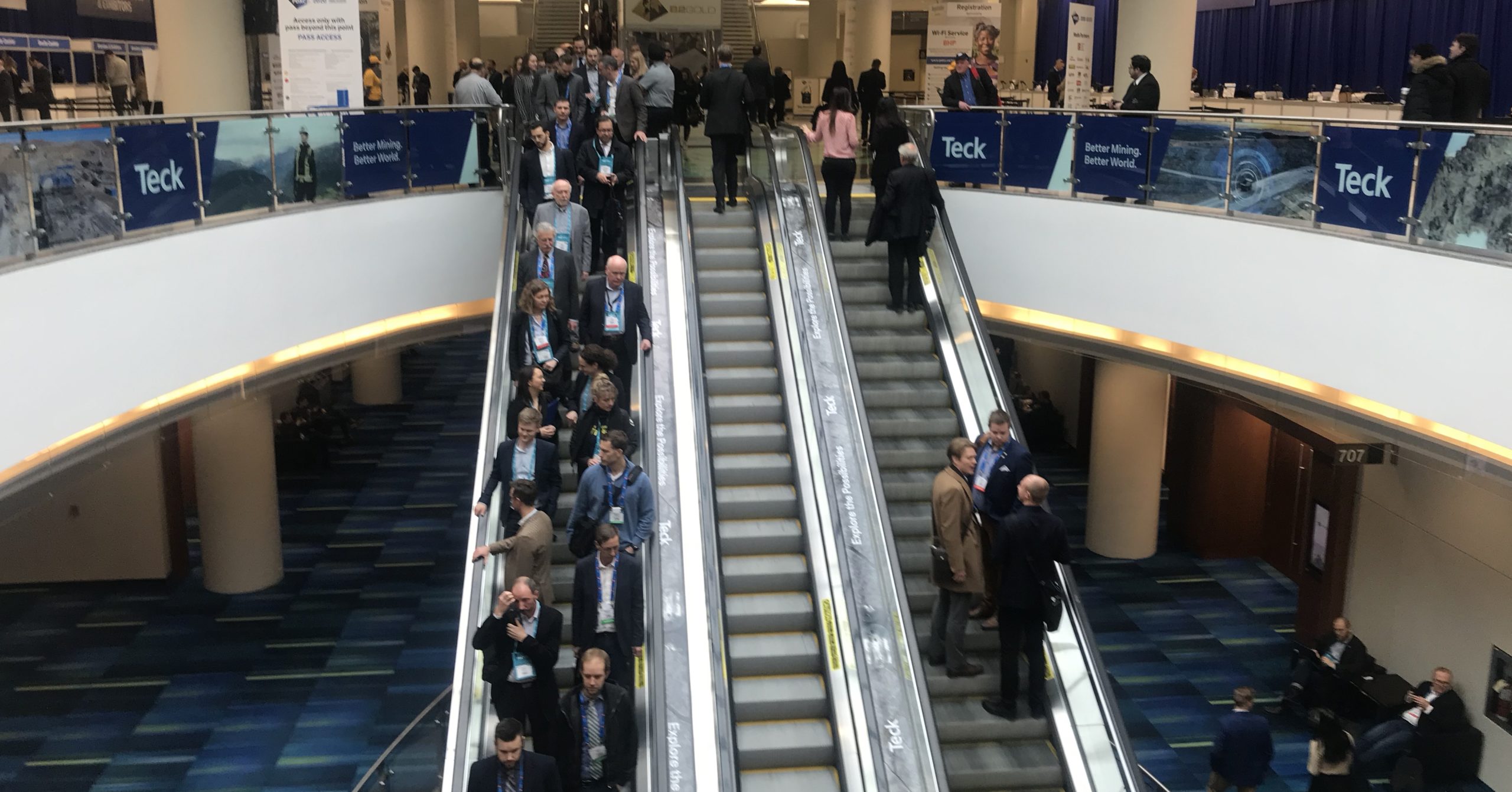 在多伦多会议中心的自动扶梯的Pdac与会者。照片:Joan Baxter。