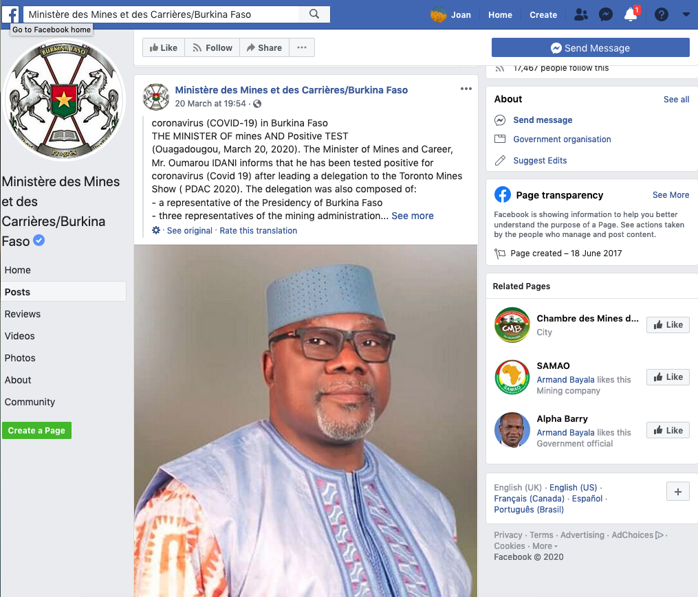 3月20日Facebook页面奥穆尔口·伊尼尼(Burkina Faso)的矿山部长Oumarou Idani发布了他在导致多伦多矿山展会(PDAC 2020)之后进行了积极的“。”该代表团包括六个Burkinabe。