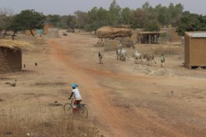 一名妇女通过Burkina Faso的Kalembouli乘以一辆退化的景观骑自行车。