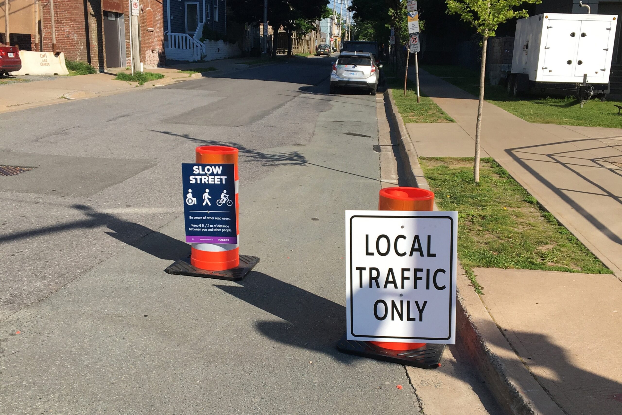 在其中一个慢街道上的标牌和交通桶 - 康沃斯附近的武士。- 照片:HRM