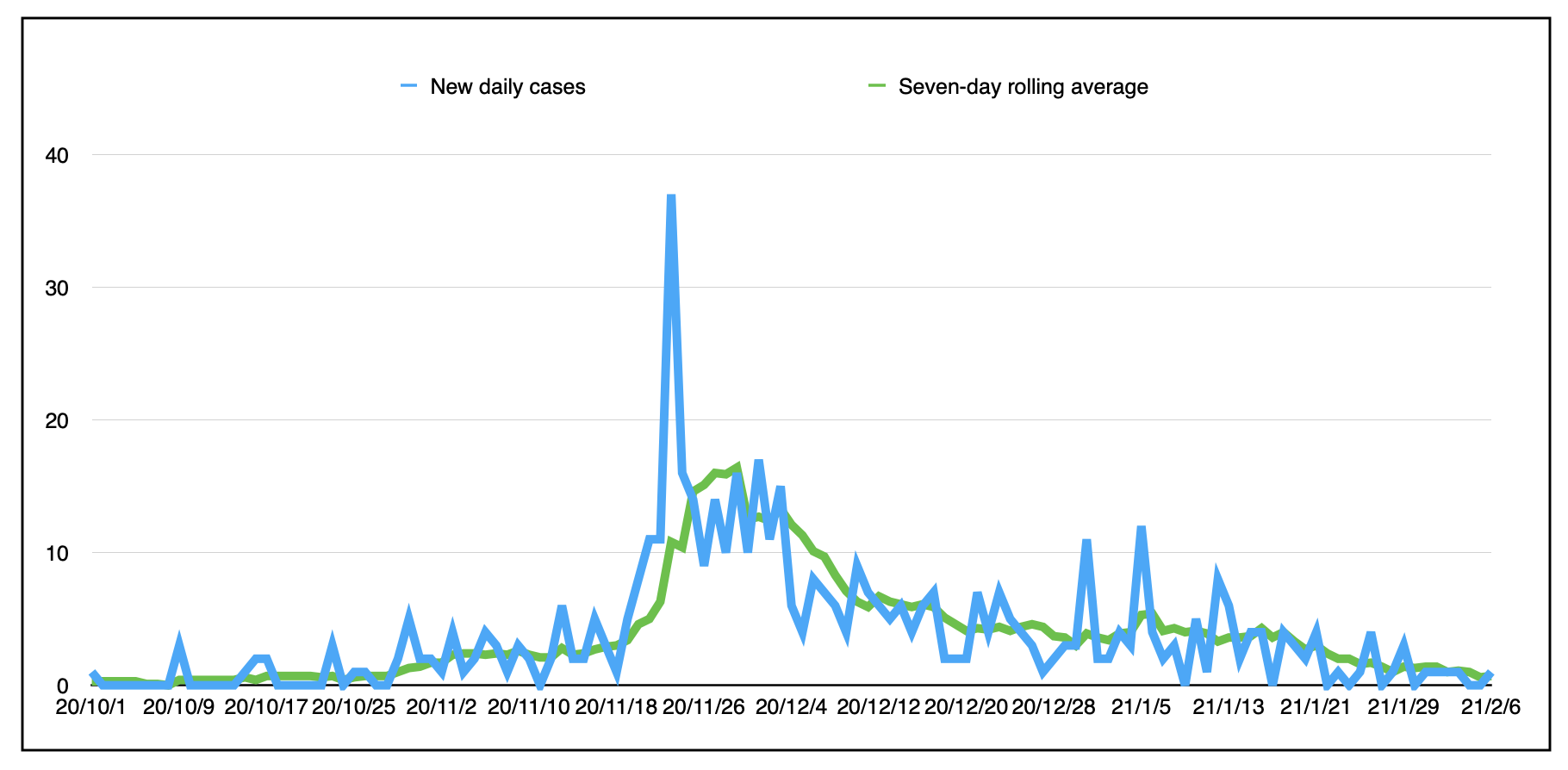 以下是新的每日案例和七天的滚动平均值(现在在0.7时),自第二波开始以来(10月1日):