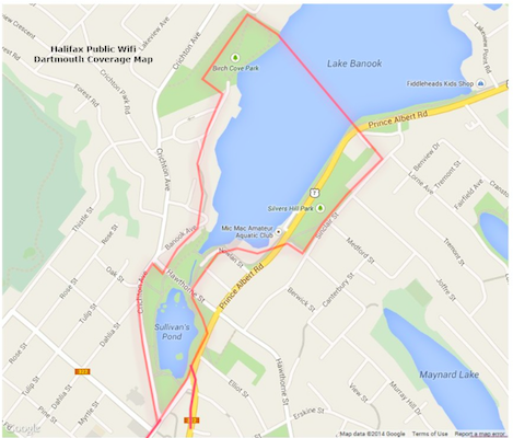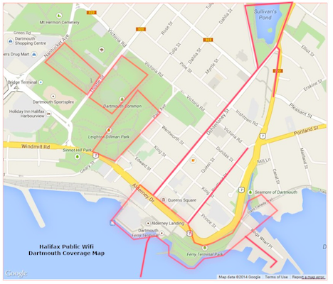 今天,哈利法克斯议会将考虑在哈利法克斯市中心和达特茅斯(上图紫色区域)设立“公共”wifi的提案。