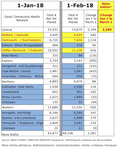 全省总人数从41877人增加到44158人,增加了2281人。这意味着哈利法克斯地铁公司实际上承担了整个打击,现在占全省家庭医生短缺的52%。NSHA区域或社区卫生网络甚至没有达到这个数字。(出于这些目的,我将Metro定义为贝德福德/萨克维尔、达特茅斯/西南、哈利法克斯半岛和切布托。)