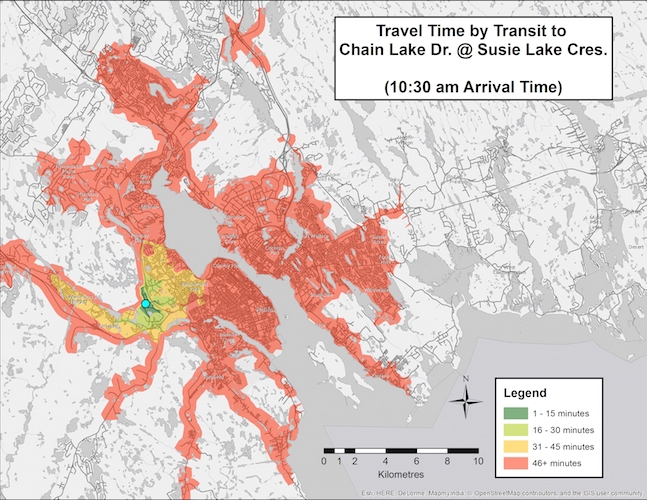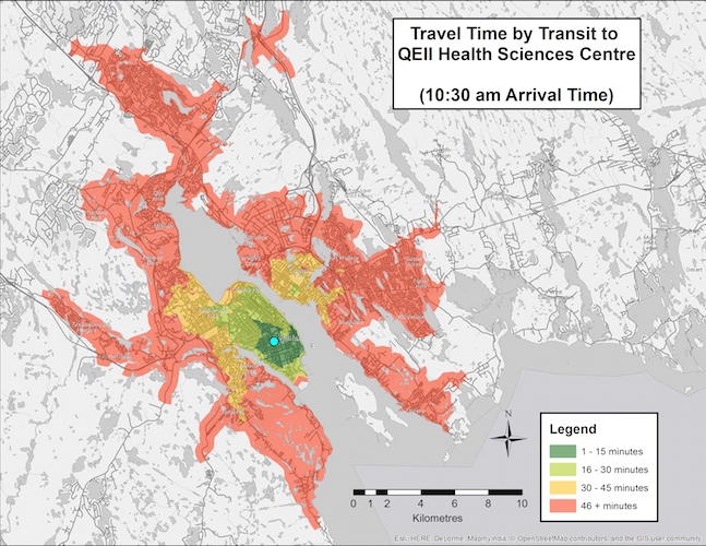 QE2可以说是大西洋地区唯一的三级医疗保健中心。它的容量比你提到的任何其他医院都要大,提供的服务也比你提到的其他医院都要多。将这些服务分散一点是好的,但在一天结束的时候,大多数被认为是“专家”的医生希望生活在城市的人力资源管理环境中。因此,将公交出行时间映射到QE2是合理的。