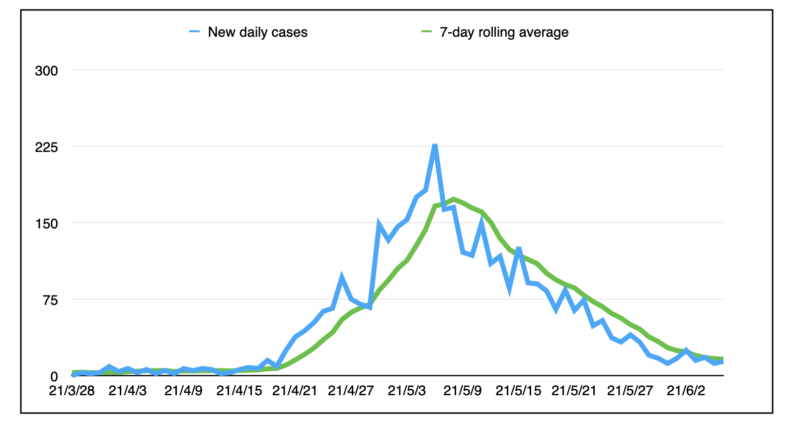 新斯科舍省的第三波大流行已基本平息,但每日病例数仍顽固地保持在个位数以上(昨天为14例)。昨天,卫生首席医疗官罗伯特·斯特朗博士表示,第二阶段的重新开放计划不可能加快,但也不太可能推迟到6月16日以后。