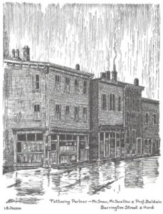 但上图所示的纹身店却并非如此,它原来位于巴林顿和赫德之间已经不复存在的十字路口。实际上,当简森的作品出版时,这家由查尔斯·斯诺先生拥有并经营的商店已经倒闭,为斯科舍广场的综合建筑让路。由于我无法亲自拍下这个地方的照片,我想这周我可以在网上搜索一下,看看能不能从某人的档案中找到一张旧照片。