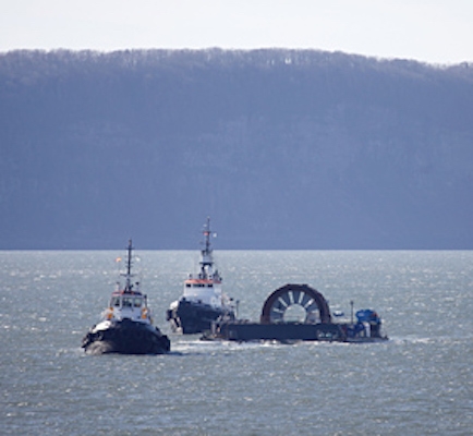2009年11月12日星期四,拖船拖着一艘装有OpenHydro涡轮机的驳船进入新斯科舍帕尔斯伯勒附近的位置。斯普利特角是背景。照片:中枢神经系统/ Len Wagg