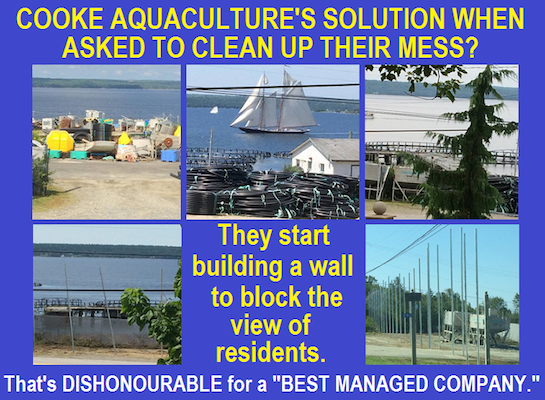 谢尔本的人们抱怨说,养鱼场经营者库克水产养殖公司(Cooke水产养殖公司)在自己的土地上扔了一堆垃圾,破坏了邻居的港口景观。所以库克的回应是…建一个四米高的篱笆那完全挡住了海港的景色。