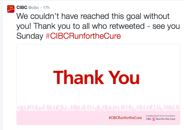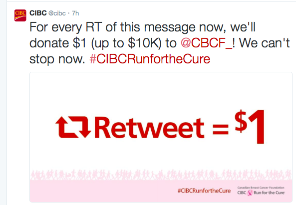 这两个目标可能是一致的:为什么不支持一场有价值的社会意识运动,同时从中获得一些增加的广告价值呢?毫无疑问,Twitter活动有利于CIBC的品牌宣传活动,将自己定位为一个有社会意识的公司。推特活动通过转发CIBC的消息让人们参与进来,并可能提高转发者的粉丝对乳腺癌的认识。这也让CIBC的名字得到了转发,并与慈善机构建立了积极的联系,从而达到了广告的目的。