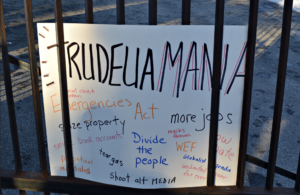 A ‘Trudeuamania’ sign placed in the gate at the Garrison Grounds where rally participants gathered on Sunday. Photo: Yvette d’Entremont