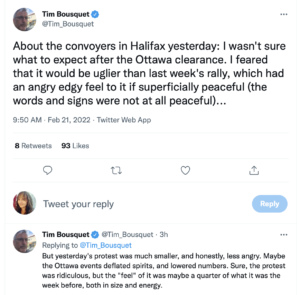 “But yesterday’s protest was much smaller, and honestly, less angry. Maybe the Ottawa events deflated spirits, and lowered numbers. Sure, the protest was ridiculous, but the ‘feel’ of it was maybe a quarter of what it was the week before, both in size and energy,” hewrote on Twitter.